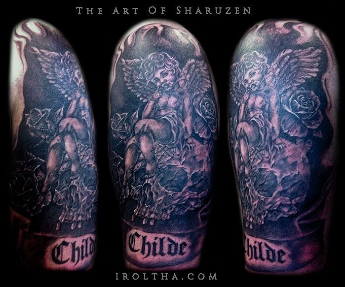 Childe left upper arm Dedication to spirit of the child. A cherub raising finger to lips to say shush sits atop a skull with pentagram inscribed on it.