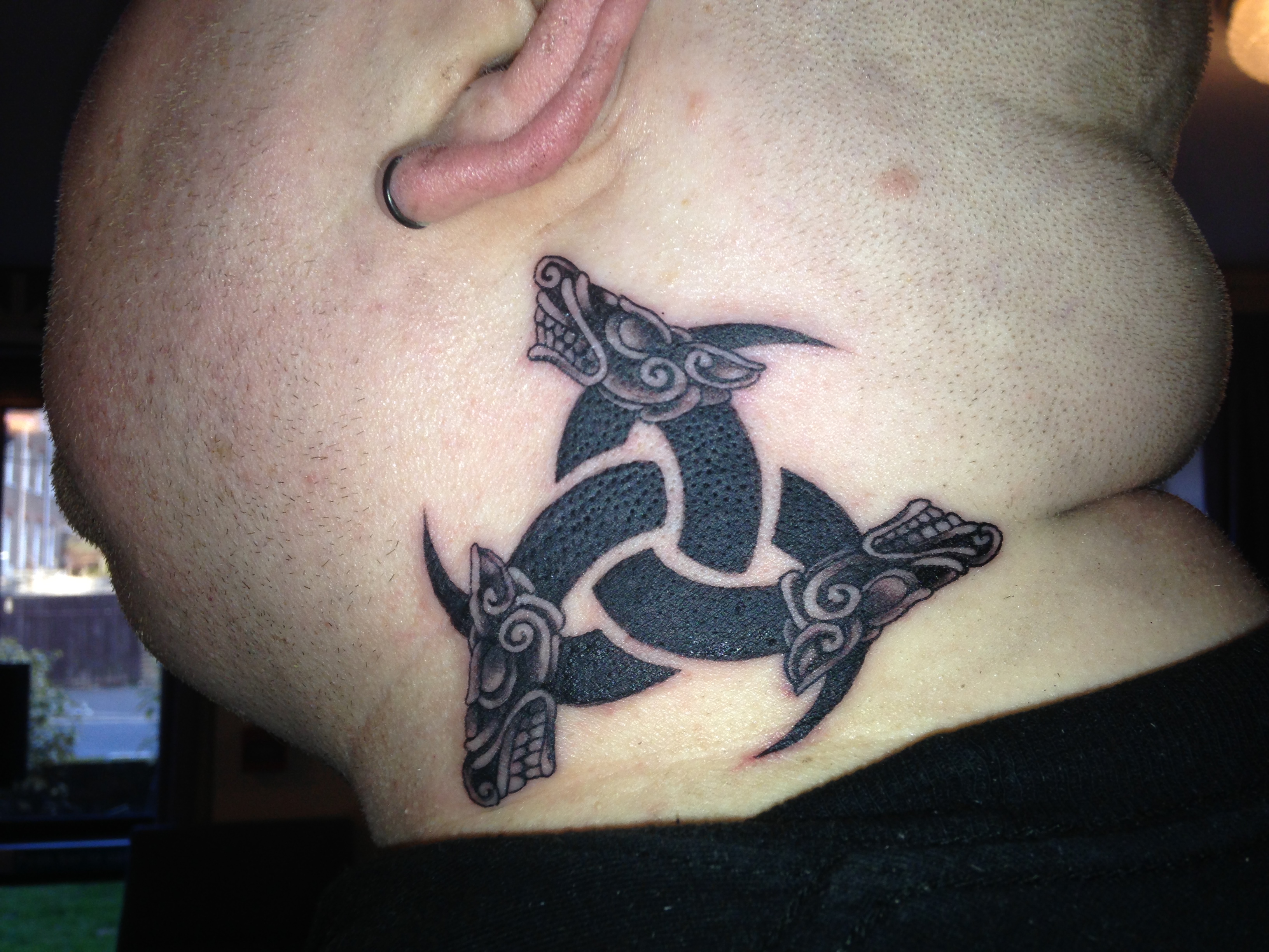 Odrerhir. Left neck. Dedication to the old gods. Wolf head drinking horns of the Mead of poetry through three realms. Power of the skald.